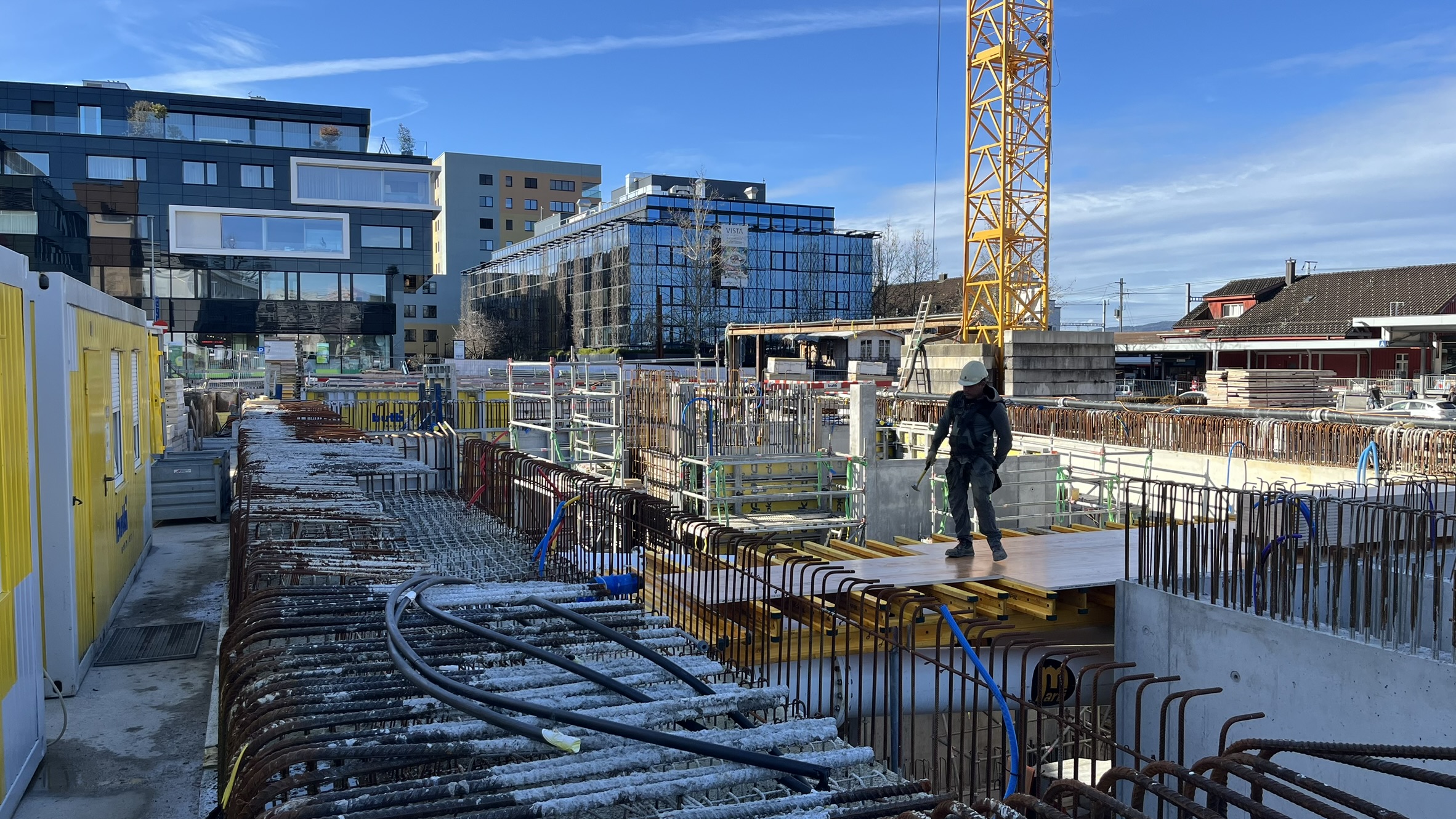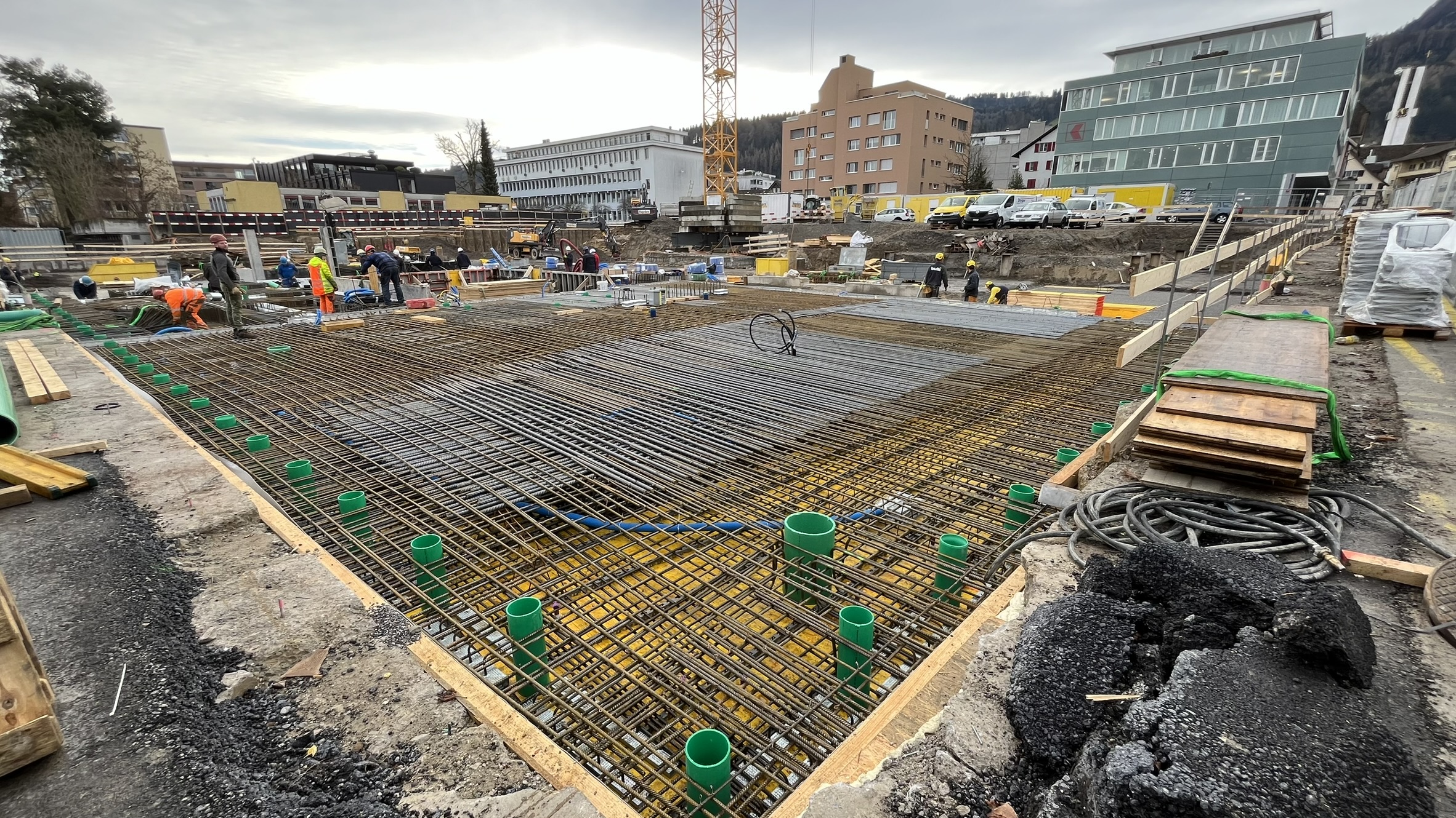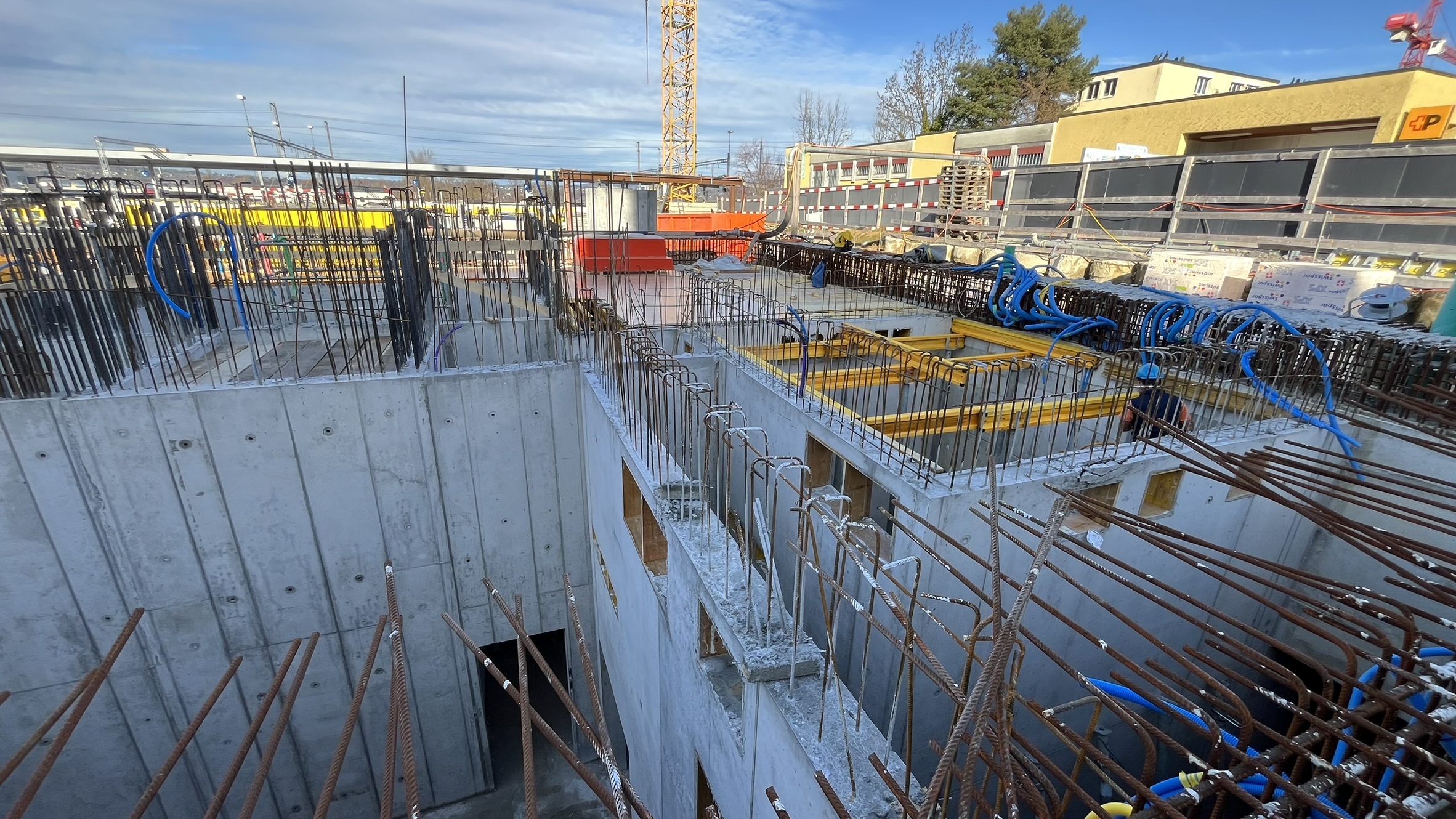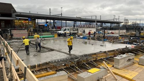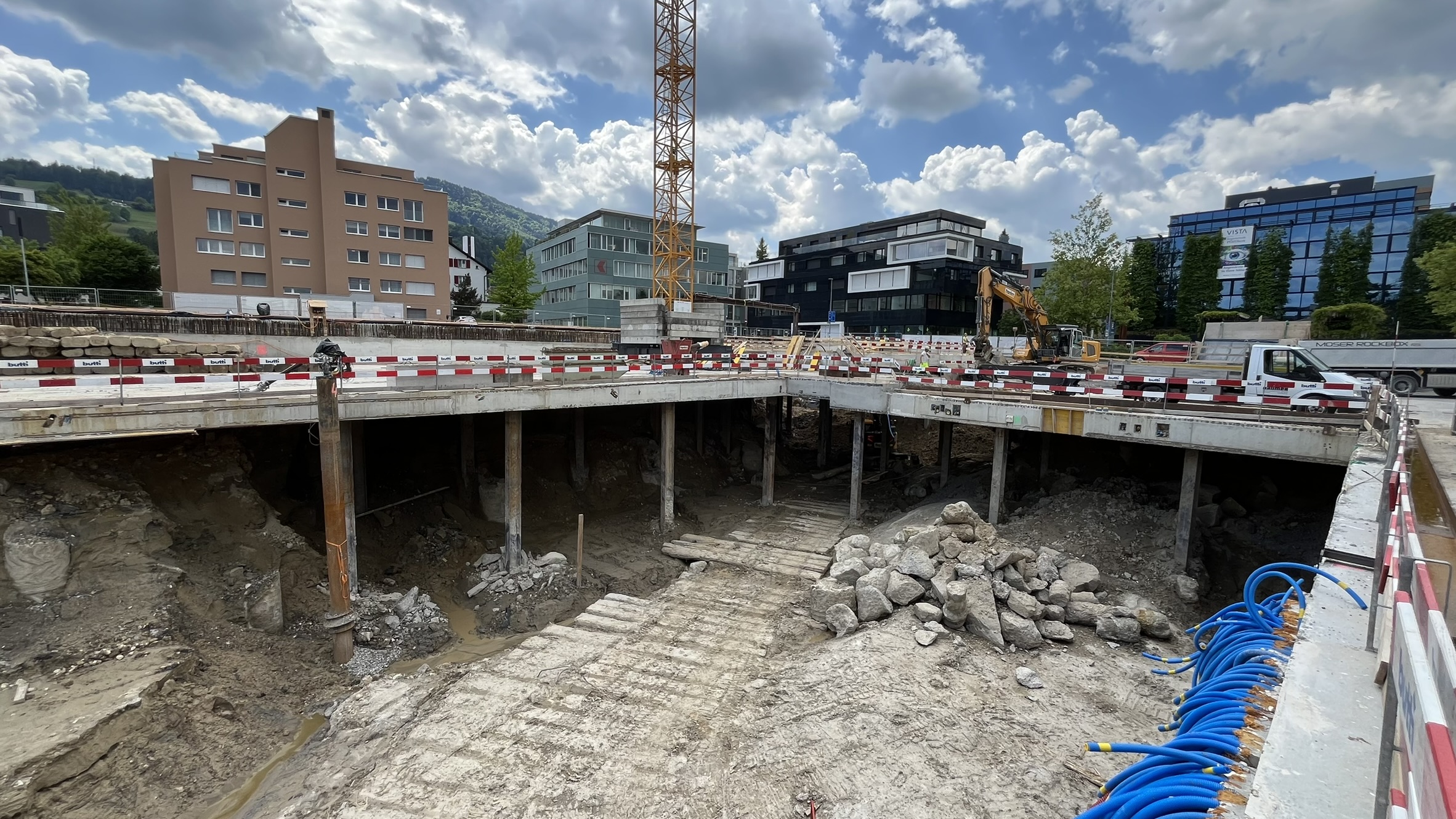 In Pfäffikon SZ entstehen drei achtgeschossige exklusive Wohn- und Geschäftshäuser, über einem gemeinsamen, zweigeschossigen Untergeschoss. Die Fundation erfolgt überwiegend über Grossbohrpfähle (Ø 880–1500 mm), welche die Lasten in den tragfähigen Molassefels ableiten. Unter der Bodenplatte wird ein 25–30 cm starker Kieskoffer eingebaut, um eine Verzahnung mit der rauen Felsoberfläche zu verhindern.