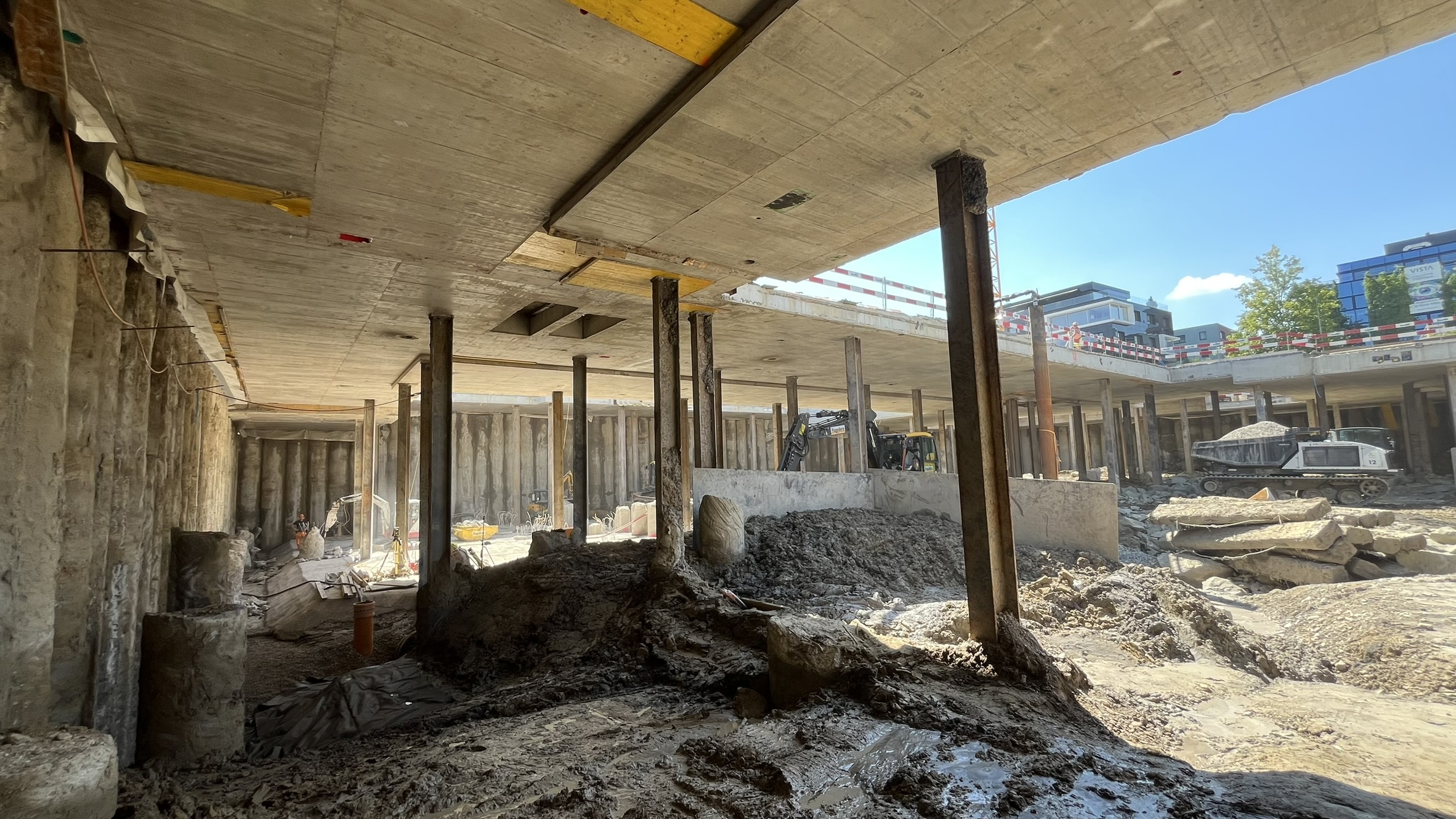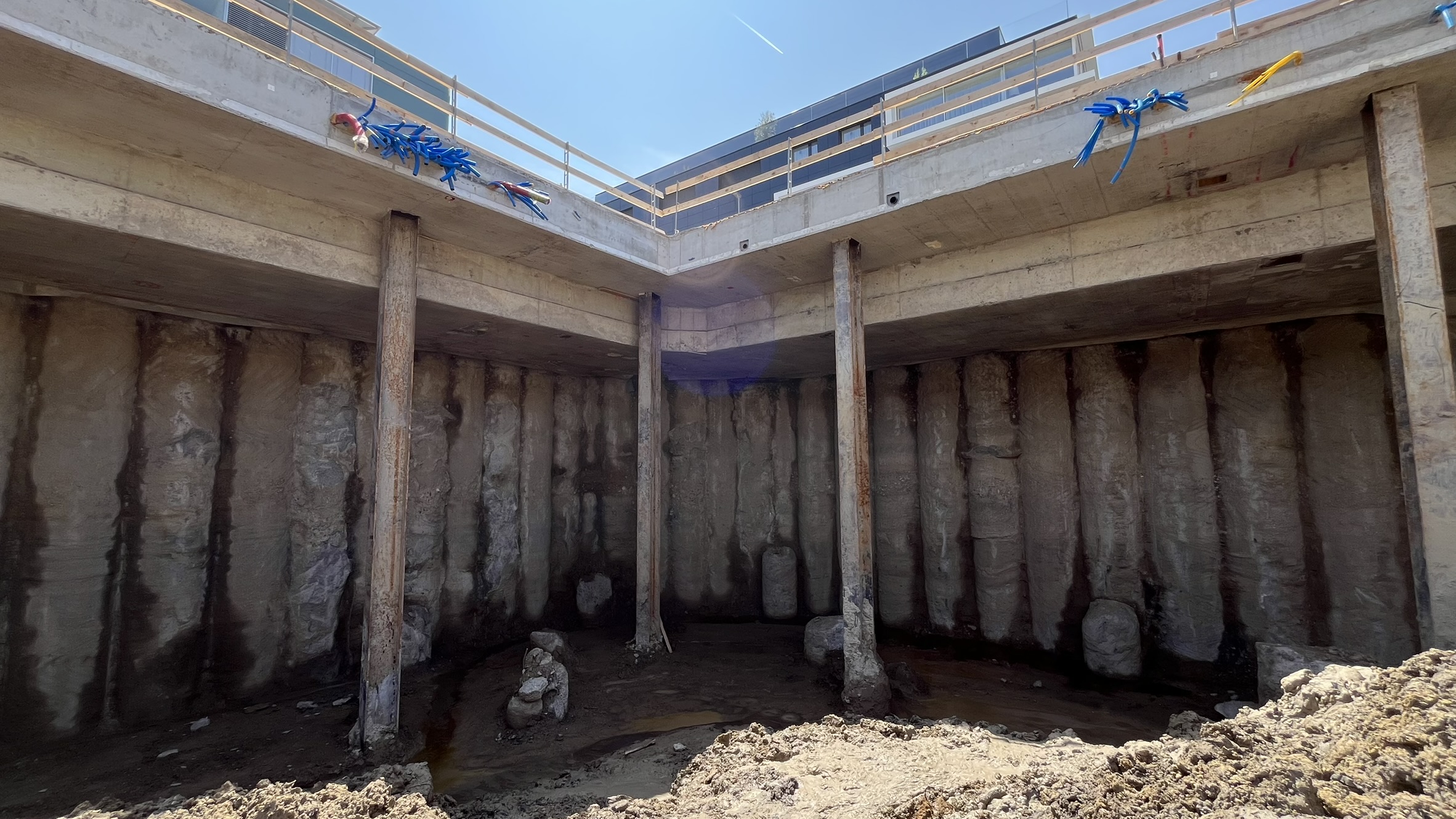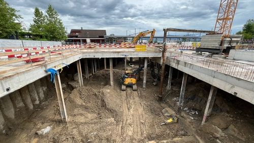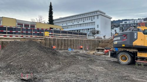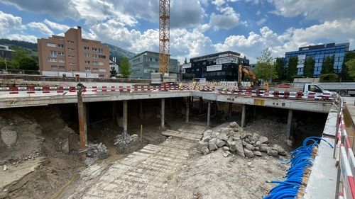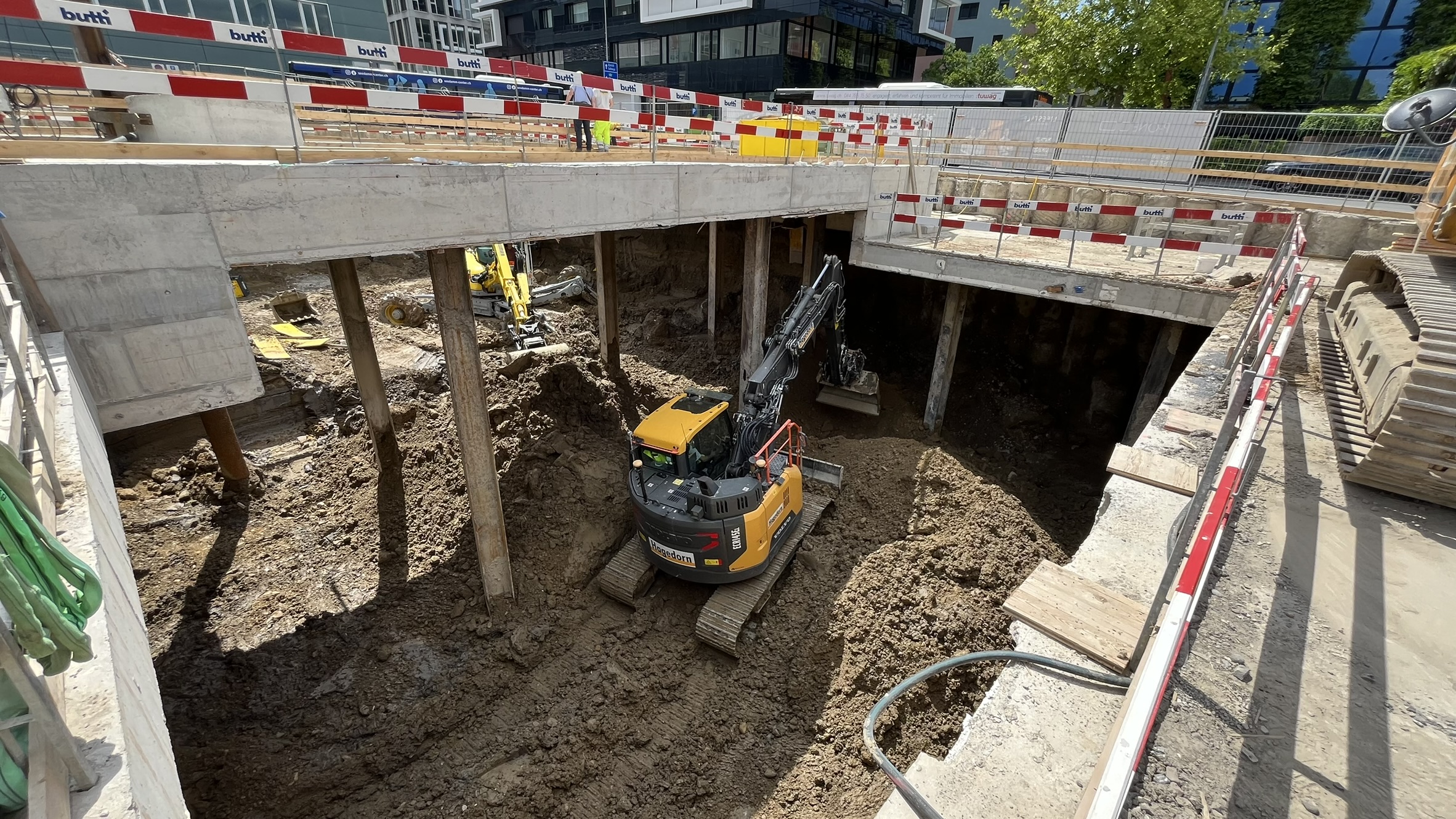 Die Baugrube wird in Deckelbauweise erstellt. Überschnittene Bohrpfahlwände bilden den Baugrubenabschluss, abgestützt durch die Decke über dem 1. Untergeschoss als Spriessdecke.