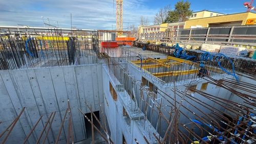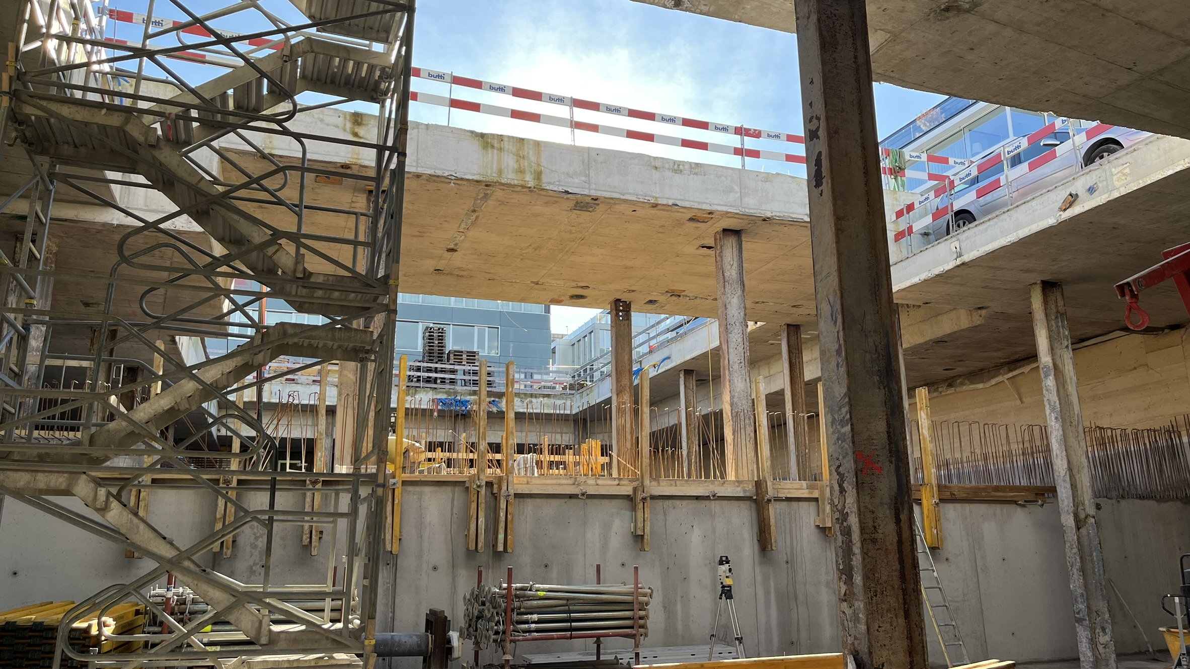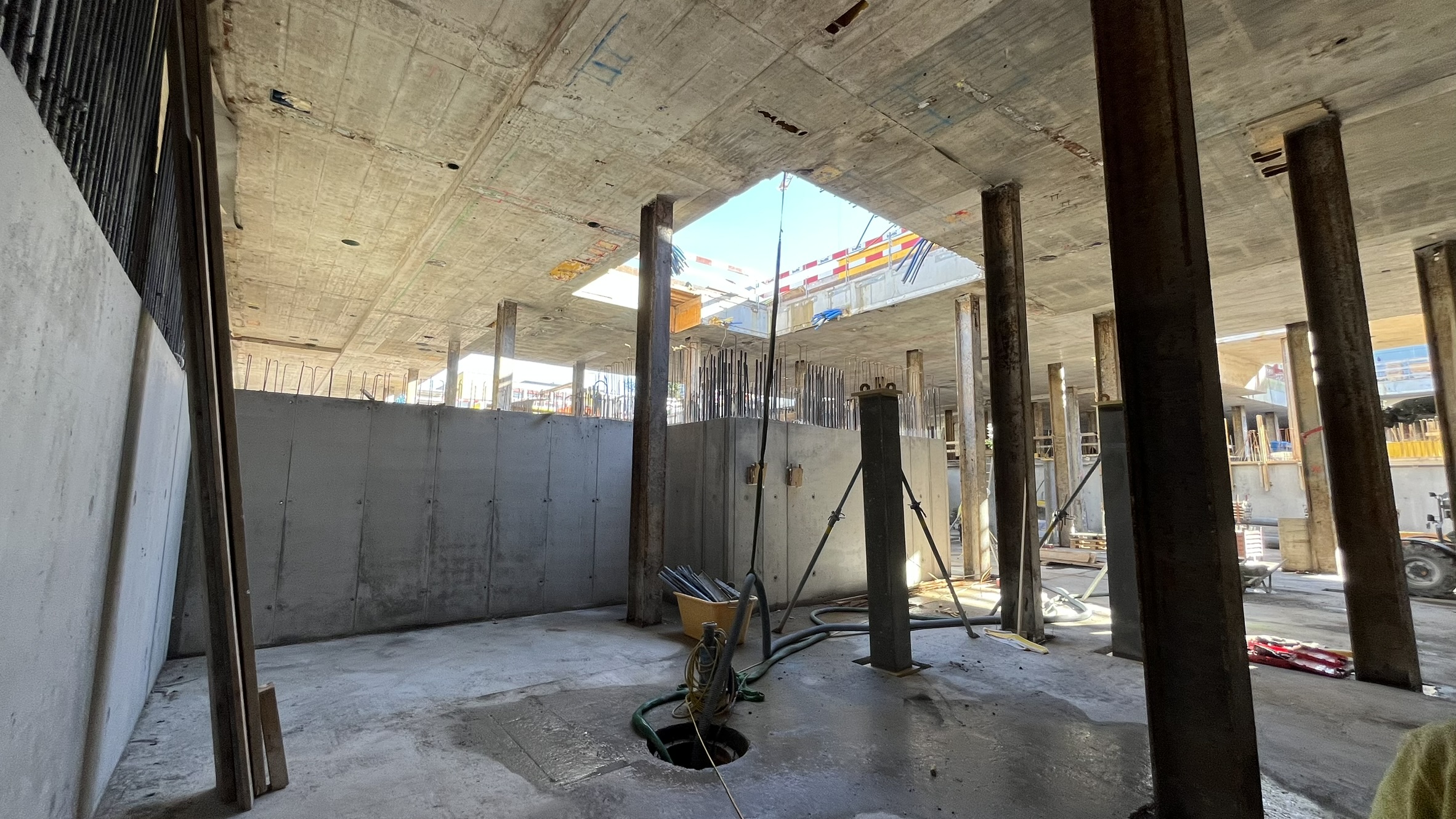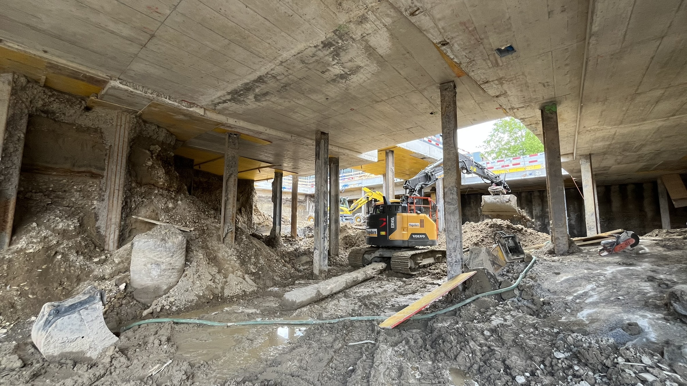 Die Baugrube wird in Deckelbauweise erstellt. Überschnittene Bohrpfahlwände bilden den Baugrubenabschluss, abgestützt durch die Decke über dem 1. Untergeschoss als Spriessdecke.
