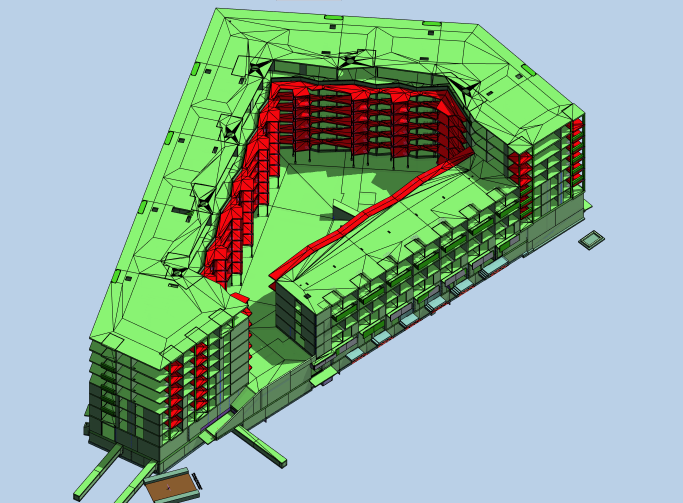 Im Krienser Mattenhof entsteht ein Neubau mit sieben Obergeschossen sowie einem durchgehenden Erd- und Untergeschoss. Der nach Süden geöffnete Blockrandbau umfasst 141 Wohnungen, drei Gewerbeflächen und eine begrünte Innenhofanlage. Die Gebäudegründung erfolgt mittels Verdrängungsbohrpfählen, die rund 25 m tief in tragfähige Schwemmfächerablagerungen reichen. Die Baugrube wird vollständig mit einer dichten Spundwand umschlossen und ist rund 4 m tief, mit variierender Baugrubensohlenhöhe. Aufgrund gering durchlässiger Bodenverhältnisse wird unter der Bodenplatte eine 30 cm starke Kiesdrainageschicht eingebaut. Tiefere Bauwerksbereiche wie Pumpenschächte werden mit abgespriessten Leichtspundwänden gesichert. Bilder: Anliker AG, Emmenbrücke